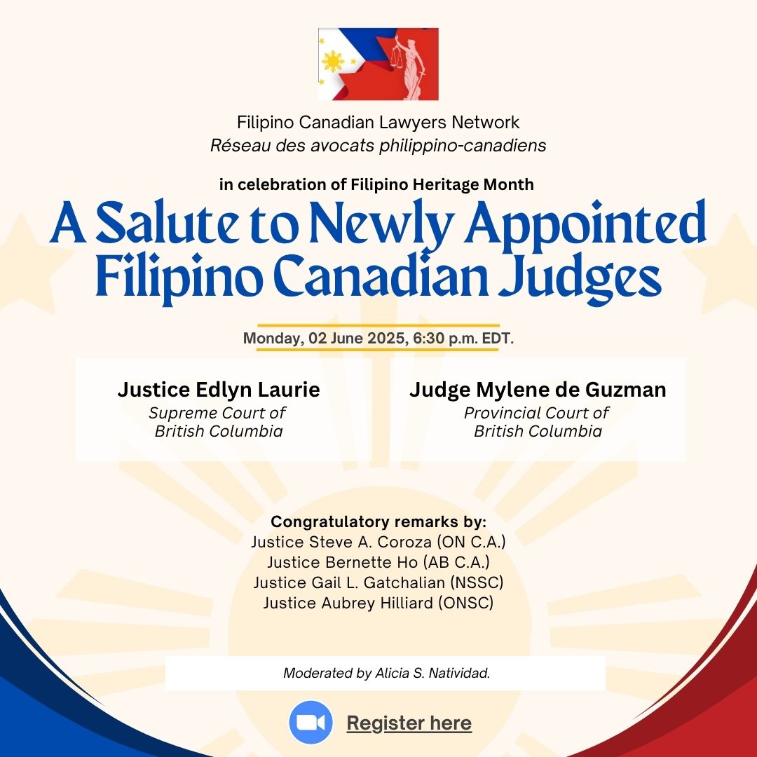 Celebrate Filipino Heritage Month with us as we honor the groundbreaking appointments of Justice Edlyn Laurie and Judge Mylene de Guzman. This event will feature speeches from esteemed judges and a chance to connect with the Filipino Canadian legal community.