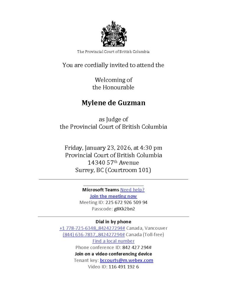 Judge Mylene de Guzman swearing-in ceremony was held on January 23, 2026, 4: 30 p.m. PT at the Provincial Court of British Columbia. Congratulations to Judge Mylene de Guzman’s appointment!